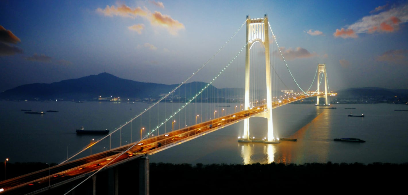 主跨1418米的三跨连续钢箱梁悬索桥,在同类型桥梁中排名世界第三、中国第一。